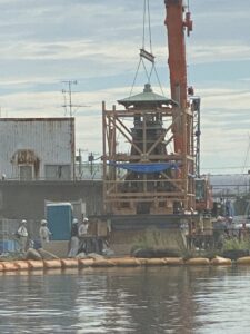 木で櫓を組んで、慎重にクレーンと台船で運んでいたそうです〜