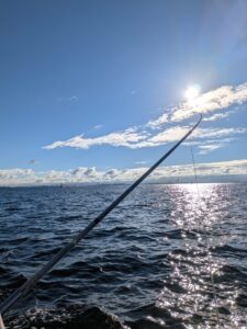 六甲アイランド沖で1時間程度ですが、2本流しながらのトローリングをしましたが、全員トローリングは今日が初めてなので、どのタイミングで釣れたと分かるのか不安でしたが・・・(;’∀’)