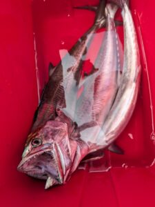 なんと、始業時間が迫っていて大急ぎでマリーナに戻る為に仕掛けを引き上げていったところ、3匹のサゴシが釣れておりました🐟🐟🐟