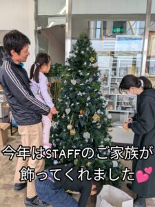 新しいスタッフも増え、普段がパパがお仕事している職場にご家族をお招きをして、クリスマスツリーの飾りつけを一緒に行っていただきました🎄