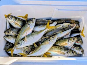 表彰がある艇が直接バースへ戻られたため、すぐに伺うと、クーラーボックスには大漁の大きなアジが~🐟🐟🐟