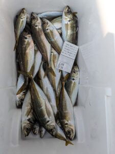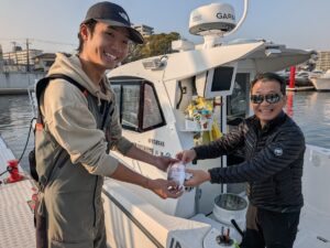 サバ、アジ、シーバスなどが釣れて本日の釣果は終わりかな??・・・と思っていたら、最後の艇のオーナー様はサゴシが面白いくらいに釣れまくったそうで(←すべてリリース)、クーラーボックスに1尾だけ入っていたお魚を頂けることになり、即席贈呈式が行われました。