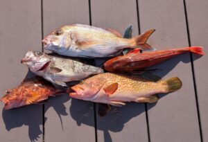今日の釣果はタイ、ホウボウ、アコウ、カサゴ、メバル!!