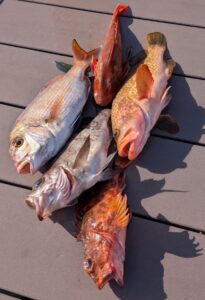 今日の釣果はタイ、ホウボウ、アコウ、カサゴ、メバル!!